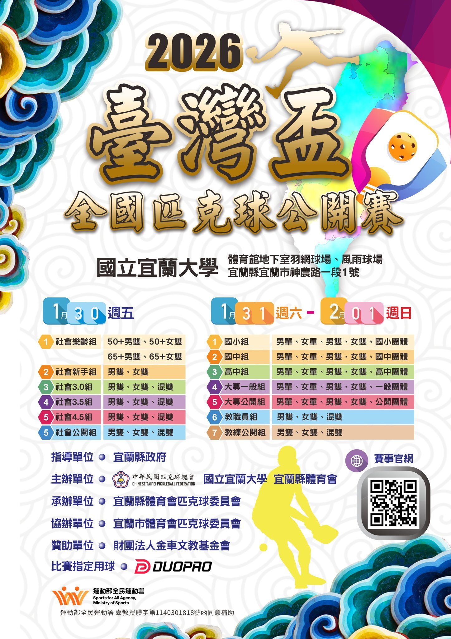 運教中心將於 1 月 30 日、1 月 31 日及 2 月 1 日(五,六,日共三天) 舉辦 2026 年臺灣盃全國匹克球公開賽,屆時因屬全國性賽事,預期將有大量車輛進出,可能造成交通與停車不便,敬請見諒。 誠摯邀請全校師生蒞臨體育館B1羽網排球場及半戶外廣場,一同共襄盛舉,為選手加油喝采。